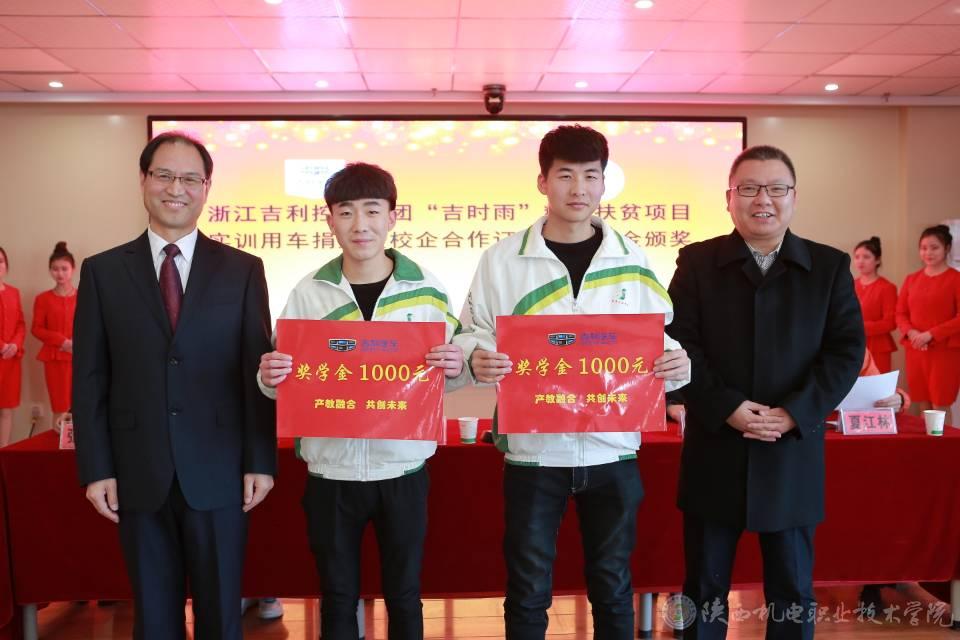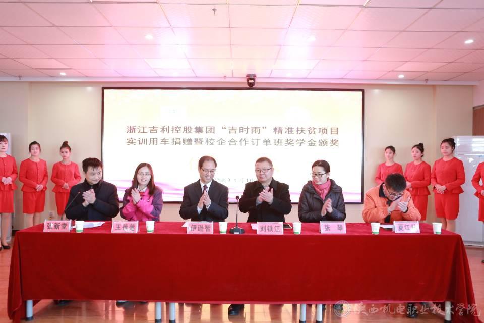 新年伊始,英国365上市公司2018年1月10日在汽车机电大楼4楼会议室隆重举行“浙江吉利控股集团‘吉时雨’精准扶贫项目实训用车捐赠暨2017年度校企合作订单班奖学金颁发仪式”。