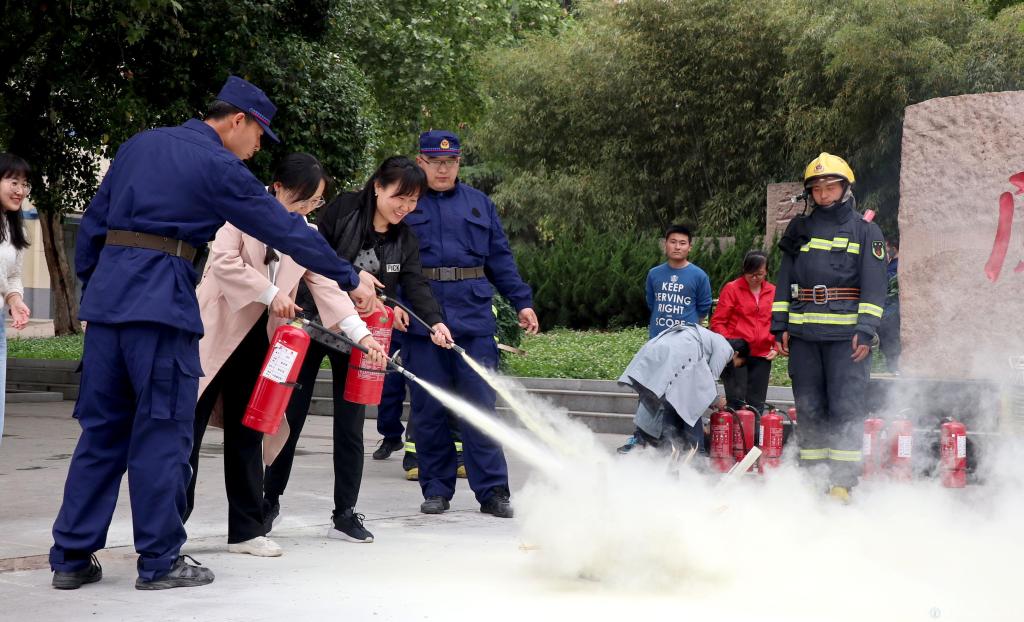 随后宝鸡市金台区消防大队巨福路支队消防员点评我此次存在的问题,并给学院全体师生讲解了灭火器的使用方法,带领师生实地进行消防灭火演练。演练过程中,参与师生都能一丝不苟的进行使用灭火器灭火的标准动作和流程操作,达到预期效果。