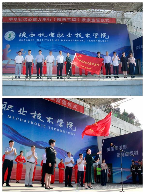 蔡少惠副会长宣读了《中华礼仪公益万里行倡议书》并为“中华礼仪公益万里行”活动陕西宝鸡站授旗,邢平礼仪工作室负责人、经济管理与艺术系党支部书记、系主任邢平代表宝鸡站接旗。