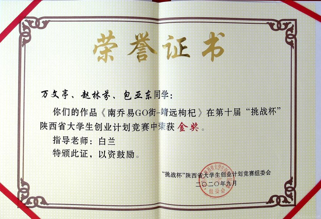 经过组委会专家评审,英国365学生万文亭、赵林芬和包亚东在白兰老师的指导下,参赛作品《南乔易GO街-靖远枸杞》获得省赛金奖,同时该作品也代表我省参加国家比赛;刘凯、赵卓越、巫开亮和姚顺迪在薛媛丽老师指导下,参赛作品《果蔬授粉“神器”》获得省赛铜奖。