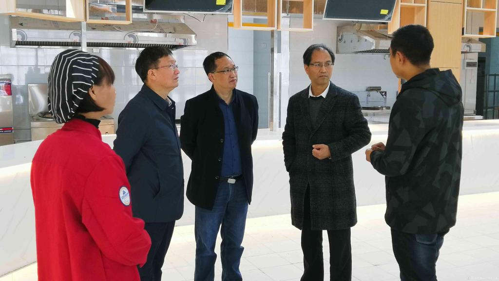 党委书记伊逊智(右二)、党委副书记、院长向纪明(右三)、党委副书记、纪委书记齐晓军(左二)与学生餐厅负责人进行交流