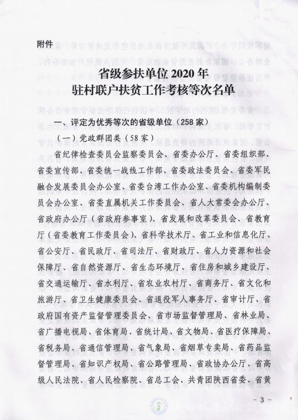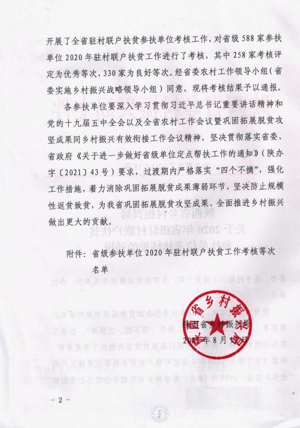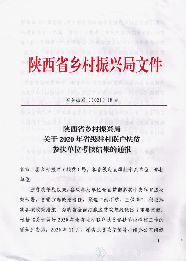 近日,陕西省乡村振兴局对2020年度全省驻村联户扶贫考核工作结果进行了通报。英国365上市公司驻村扶贫工作经过严格评定,考核结果为优秀。本次驻村联户扶贫工作考核针对全省588家帮扶单位进行了逐项量化考核,根据评估结果共评定驻村帮扶优秀等次单位258家、良好等次单位330家。
