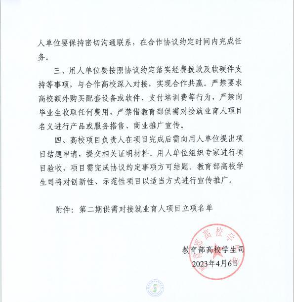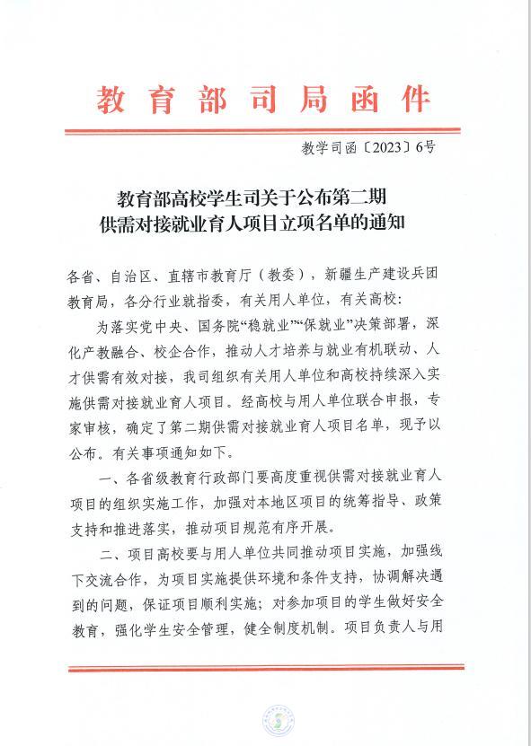 教育部供需对接就业育人项目是为深入贯彻落实党中央、国务院“稳就业”“保就业”决策部署,深化产教融合、校企合作,推动人才培养与就业有机联动、人才供需有效对接,由教育部高校学生司组织有关用人单位和高校实施的就业育人项目。2022年10月,教育部发布了第二期供需对接就业育人项目申报指南,学校招生就业处联合各学院积极联系相关企业,认真了解企业发展、人才培养、项目申报等相关情况,积极组织推进此次项目申报工作。最终,经教育部审核,3项申报项目获得批准。