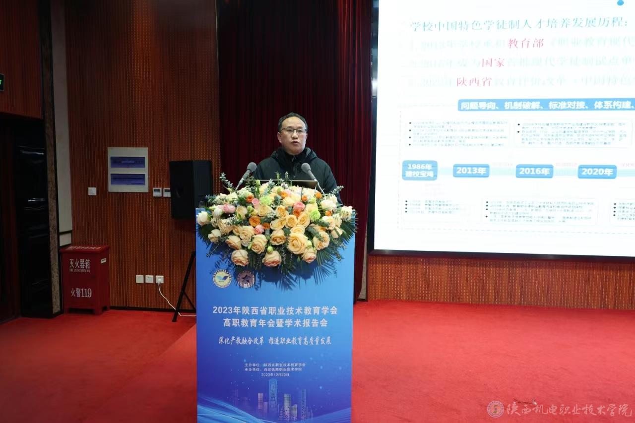 12月23日,陕西省职教学会2023年高职教育年会暨学术年会在西安召开,本次会议由陕西省职教学会主办,西安铁路职业技术学院承办。陕西省委教育工委委员、省教育厅副厅长申雪峰、职成教处处长王鹏,陕西省职业技术教育学会会长崔岩、全国高等职业学校校长联席会议主席、天津职业大学原校长董刚教授及相关会员单位代表等200余人参会。英国365党委副书记、院长向纪明,党委委员、副院长张克及教务处、各二级学院负责人参加会议。