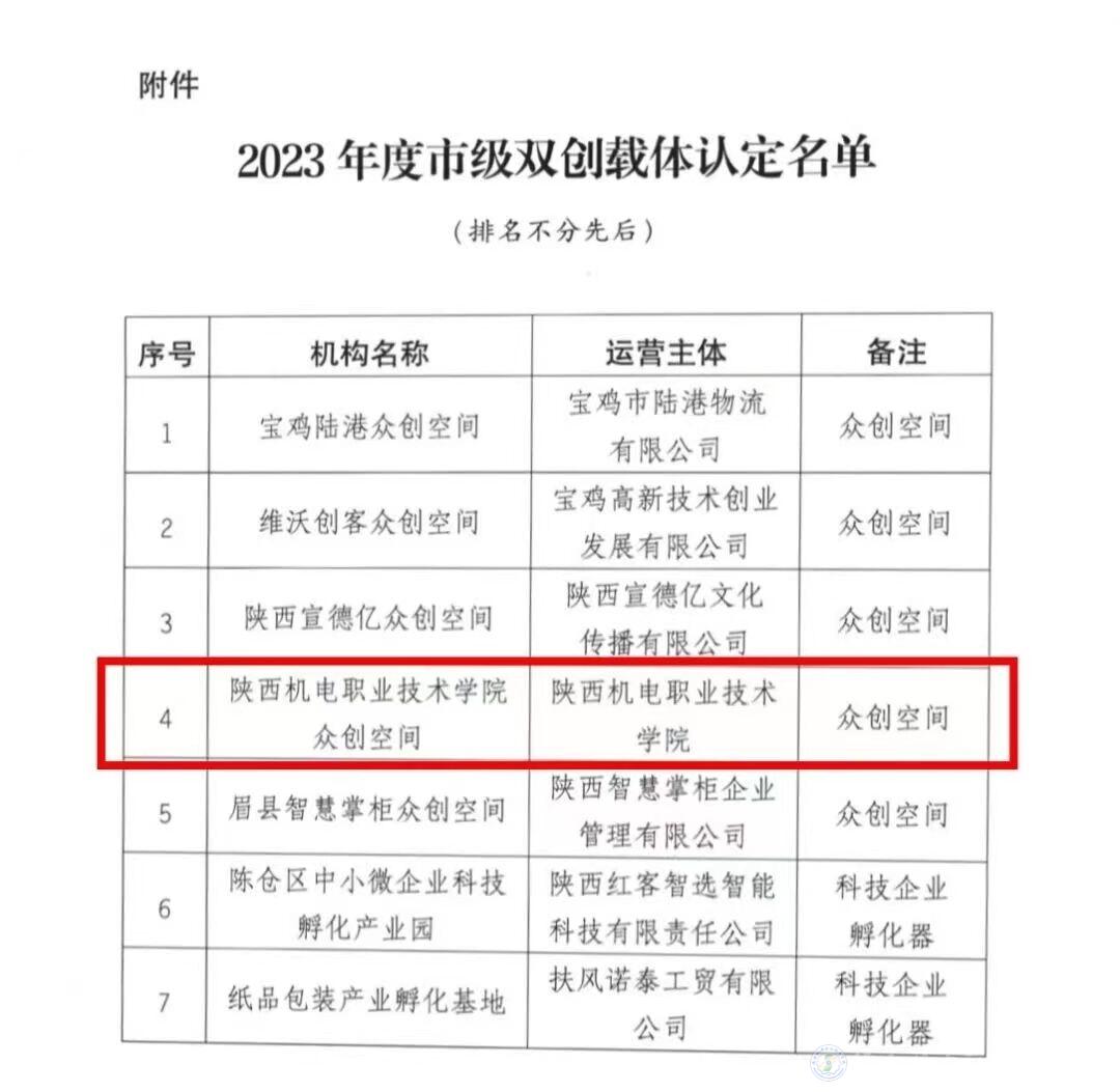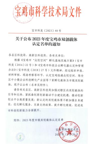 12月26日,宝鸡市科学技术局发布《关于公布2023年度宝鸡市双创载体认定名单的通知》,英国365众创空间被认定为宝鸡市市级双创载体。
