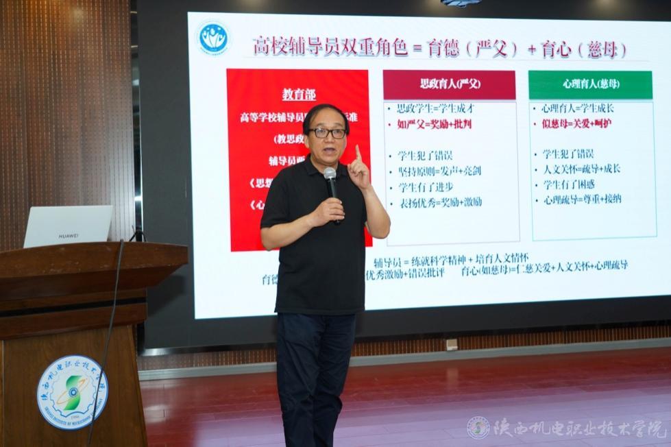 陕西省高校心理素质教育研究会会长郑林科教授以“心理健康教育与危机干预预防”为主题,深入剖析了学生常见的特异心理,分享了心理健康教育的重要性和有效方法。他强调,心理健康教育是引导学生德智体美劳全面发展的关键所在,辅导员、班主任要用心关爱学生,建立和谐的师生关系。