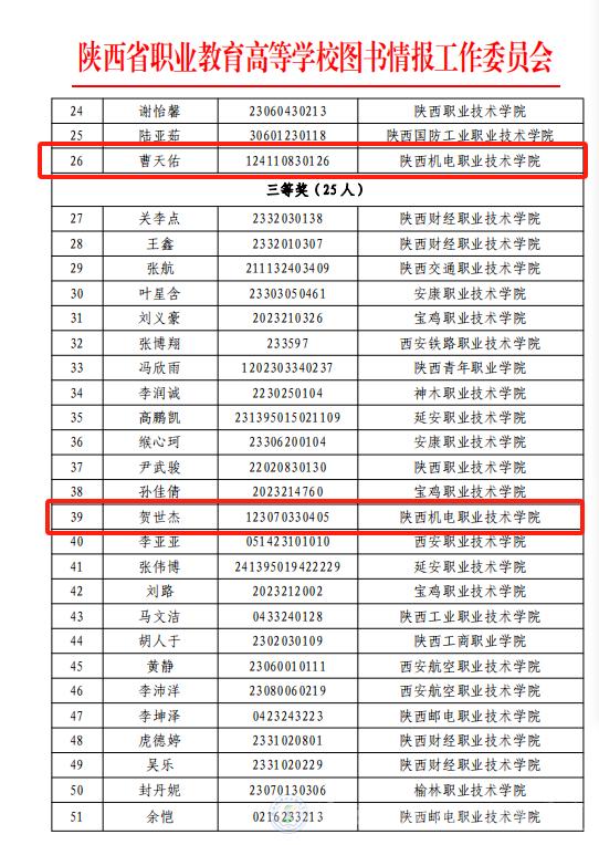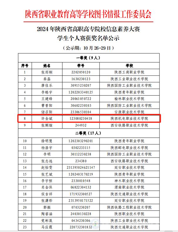 10月26日,由陕西省职业教育高等学校图书情报工作委员会主办的2024年陕西省高职高专院校信息素养大赛暨“中文在线杯”第六届全国大赛选拔赛圆满落幕。此次大赛吸引了全省21所高职院校的84名选手参与。经过激烈角逐,英国365智能制造学院学生许金斌脱颖而出,荣获一等奖,铁道工程学院学生曹天佑荣获二等奖,电子信息学院学生贺世杰荣获三等奖。其中,许金斌和曹天佑两位同学入围国赛资格名单。