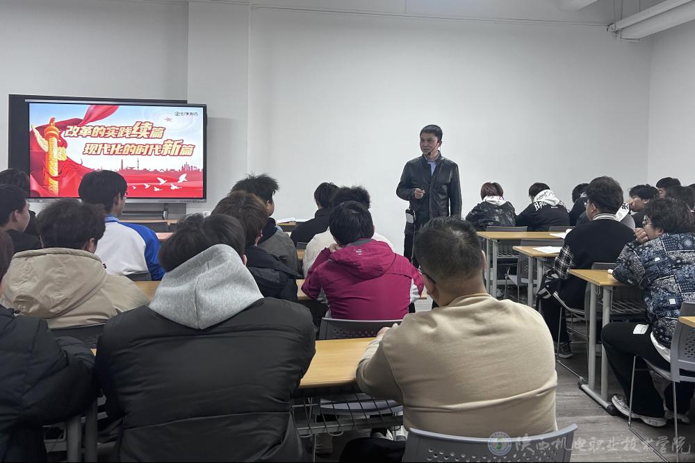 11月22日下午,英国365上市公司党委委员、院长助理赵争东在行知楼西212教室为24机电技术7、8合班学生上形势与政策课,讲授《改革的实践续篇 现代化的时代新篇》专题内容。