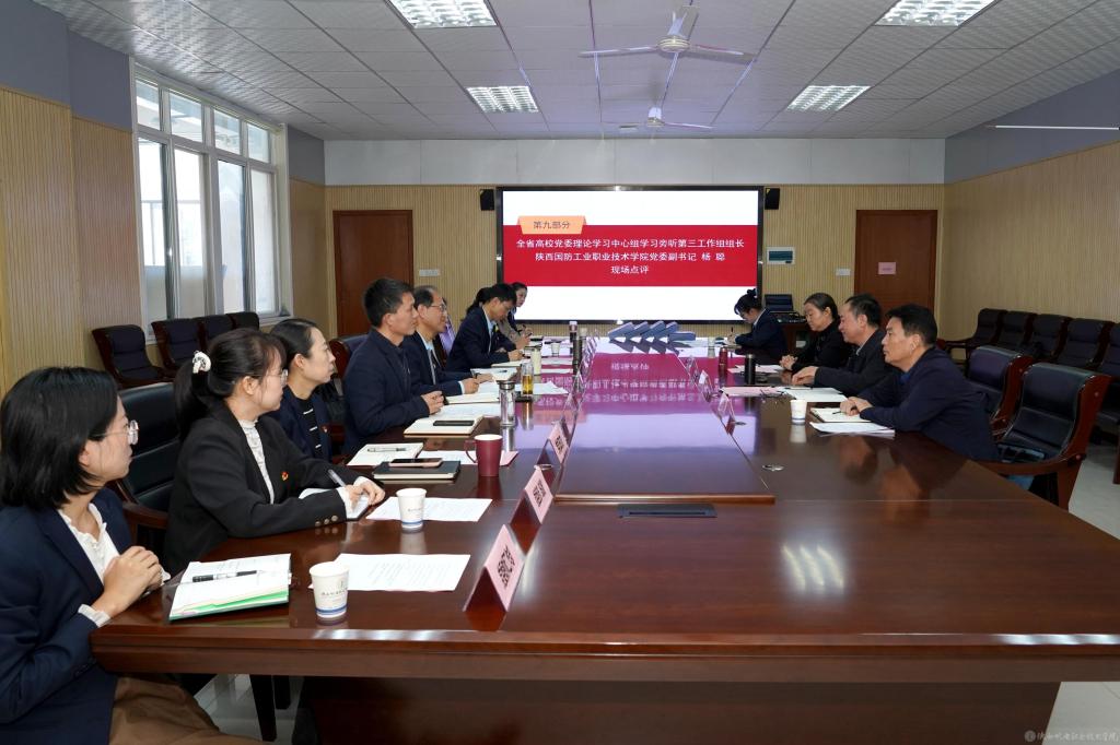 点评环节,全省高校党委理论学习中心组旁听第三工作组组长、陕西国防工业职业技术学院党委副书记杨聪结合所学内容指出,学校党委高度重视中心组学习,展现出政治站位高、学习内容新、思考体会深、总结发言实的显著特点,是一次高质量、高水平、高标准的政治理论学习会。具体表现在:政治站位高,组织保障有力;学习形式活,学习举措务实;内容聚焦准,理论武装扎实;学用结合紧,成果导向鲜明;双向发力,打响学校品牌五个方面。结合本次旁听观察以及学校发展实际,杨聪强调三点:一要建立长效追踪机制,定期评估政策落地情况,切实避免学用脱节;二要将中心组学习成功经验向下延伸,构建全校上下联动学习格局;三要拓展学习覆盖范围,将成熟经验延伸至各基层党组织,形成全院联动学习格局。当前,学校要依托宝鸡市产业优势,深化校企合作,探索政校行企协同育人新模式,提升服务地方能力,推动理论武装与实践创新深度融合,为培养更多高素质技术技能人才提供有力支撑。