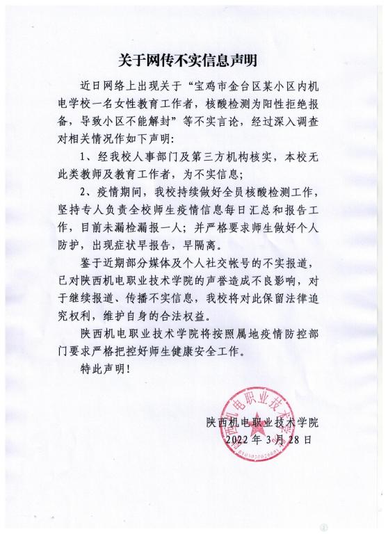 近日网络上出现关于“宝鸡市金台区某小区内机电学校一名女性教育工作者,核酸检测为阳性拒绝报备,导致小区不能解封”等不实言论,经过深入调查对相关情况作如下声明: