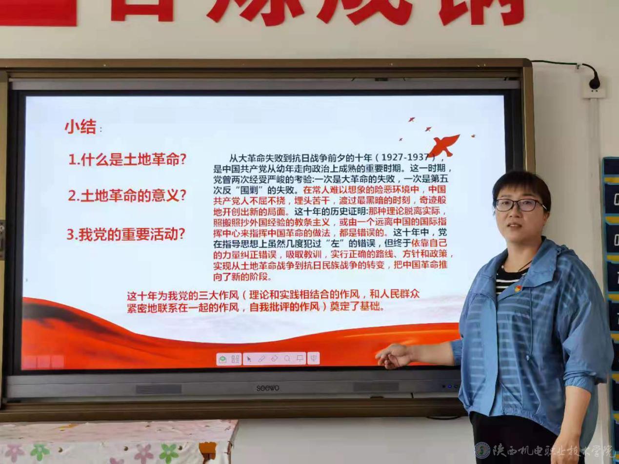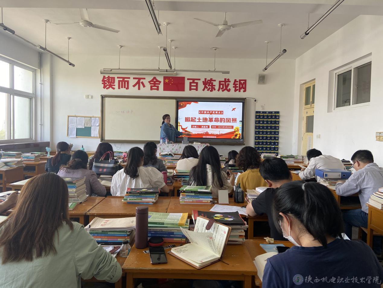 学习百年党史,汲取奋进力量。5月24日下午,基础部党支部在宝福路校区403教室开展集体学习活动,党支部书记满春燕同志以“掀起土地革命的风暴”为主题给支部全体党员开展了一次生动、深刻的党课教育。